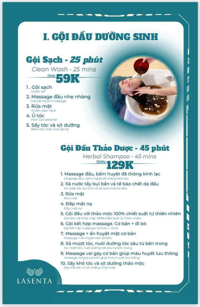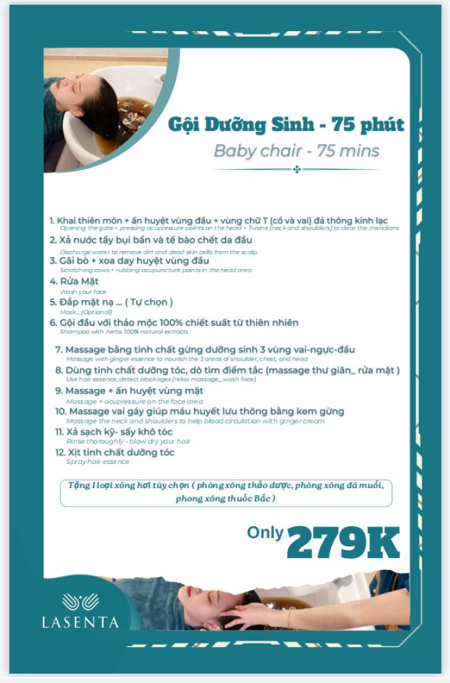 - 두피 관리 샴푸: 머리와 두피에 특별한 관리를 해주는 케어로, 머리, 어깨, 목, 등 부위를 마사지하면서 천연 허브 성분인 레몬그라스, 플럼케이크, 자몽 껍질, 퀴 등을 사용한 샴푸로 두피와 머리를 깨끗하게 해줍니다.