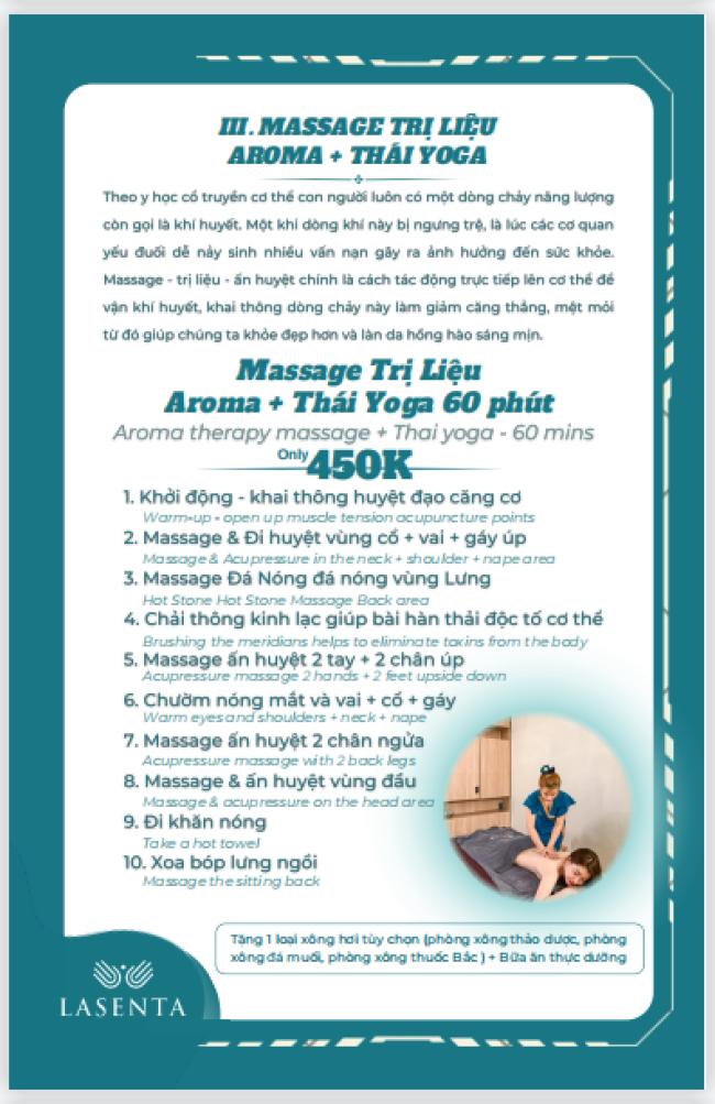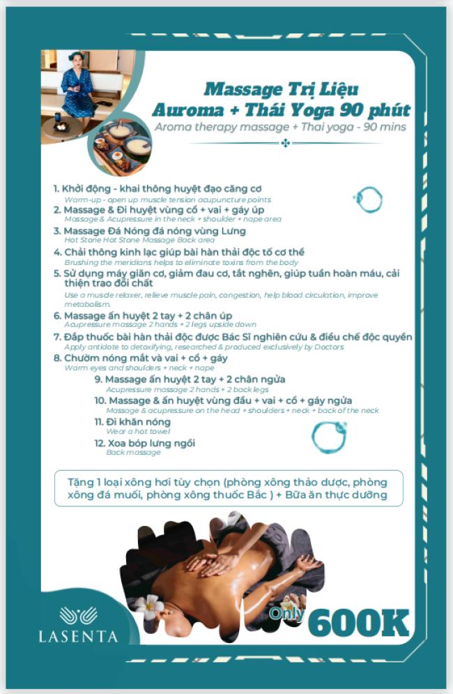 - 아로마 마사지: 다양한 마사지 기술과 함께 향기로운 향기의 에센셜 오일을 조합한 마사지입니다. 또한 고객에게 편안함을 제공합니다.